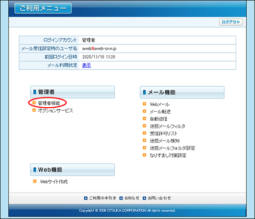 アルファメールプレミアにログインし、ご利用メニューが表示されます。