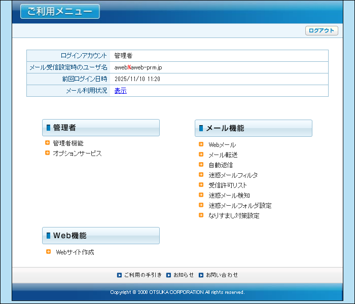 アルファメールプレミアにログインし、ご利用メニューが表示されます。