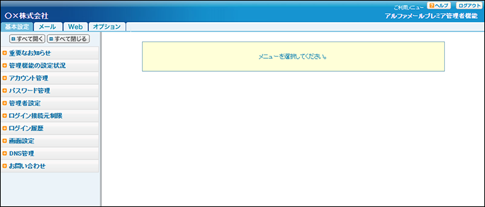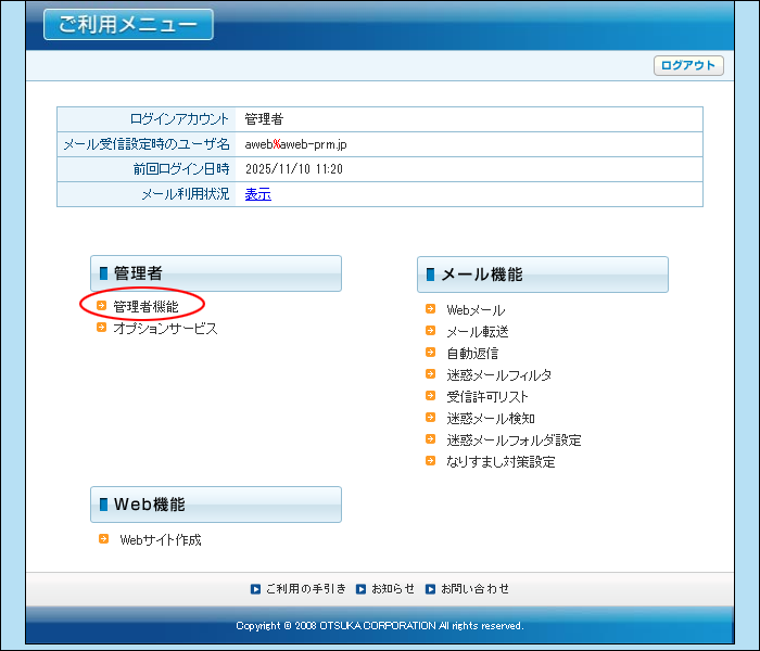 step1 アルファメールプレミアにログインし、「管理者機能」をクリックします。