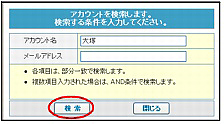 アカウント別機能設定では、アカウント検索の操作方法はすべて同じです。本説明を参考にアカウント検索を行ってください。