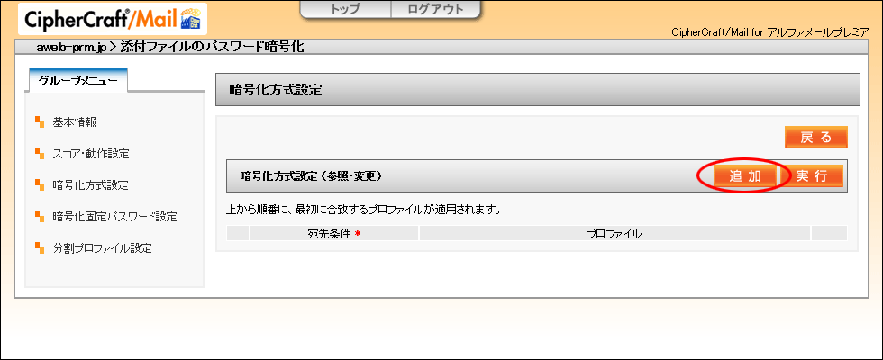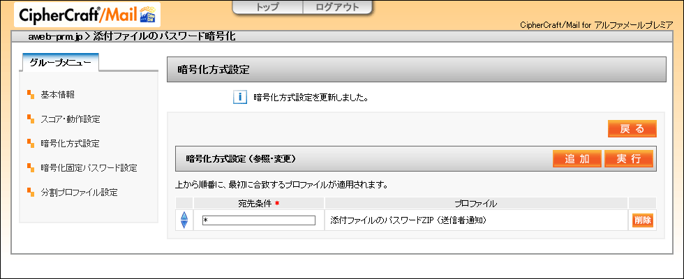 | プロファイル選択 | 「添付ファイルのパスワードZIP(送信者通知)」もしくは「添付ファイルのパスワードZIP(受信者通知)」を選択 |