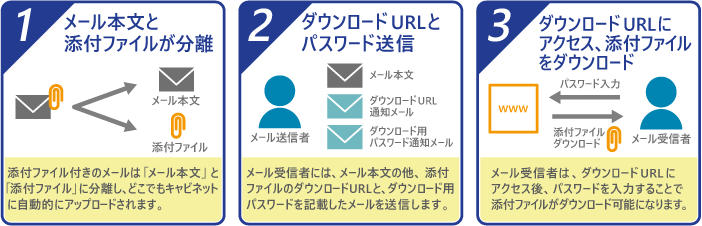 受信者には添付ファイルダウンロード用のURLとパスワードメールを別途送信し、「どこでもキャビネット」からデータをダウンロードしていただくことで添付ファイルを安全に送信できます。