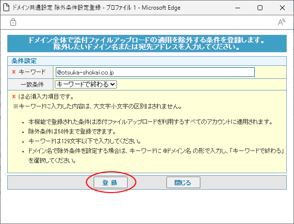 添付ファイルアップロード ドメイン共通除外条件設定画面が表示されます。