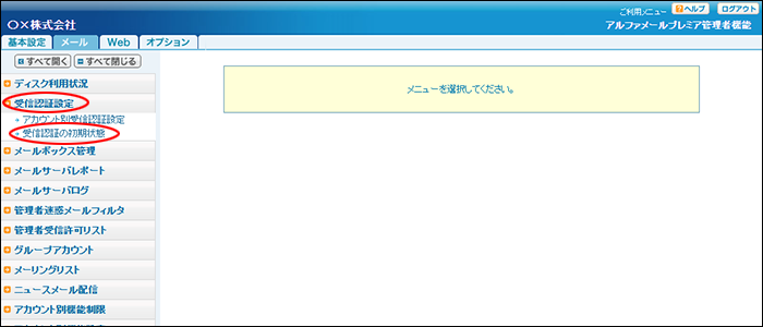 step1 メール画面を表示し、「受信認証設定」→「受信認証の初期状態」の順にクリックします。