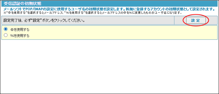 ここで設定した受信認証の初期状態が、新規に登録するアカウントの初期状態として適用されます。