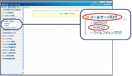 step1 メール画面を表示し、「メールサーバログ」→「POPログ」の順にクリックします。