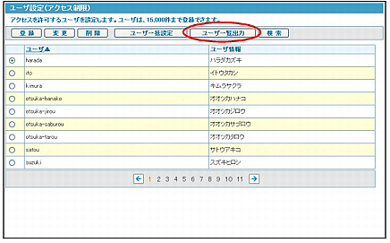step1 ユーザ設定(アクセス制限)画面を表示し、「ユーザ一覧出力」ボタンをクリックします。