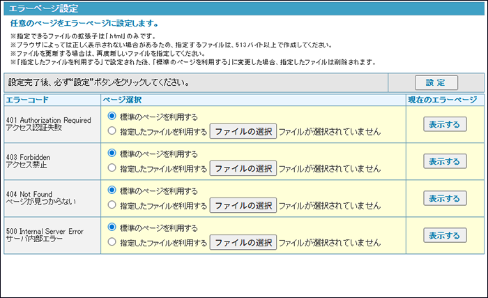 エラーページ設定に戻る