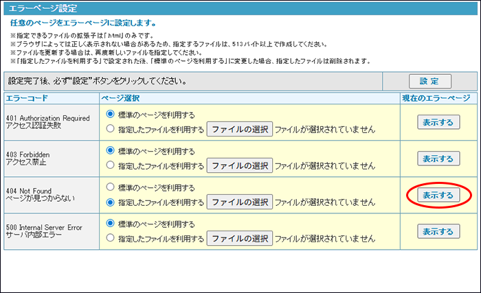 step1 エラーページ設定画面で、確認するエラーページの「表示する」ボタンをクリックします。