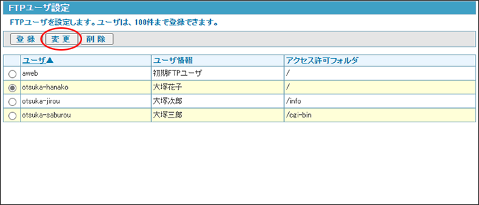 step1 FTPユーザ設定画面を表示し、変更するFTPユーザを選択して「変更」ボタンをクリックします。