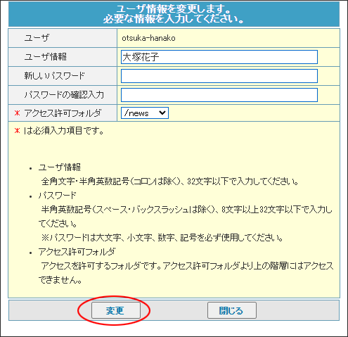 step2 必要事項を入力し、「変更」ボタンをクリックします。