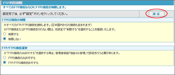 独自SSLを設定していない場合、FTPSでの通信が出来ないため、FTP(S)接続の制限を「制限しない」、FTP/FTPS接続選択を「FTP/FTPS接続のみ許可する」で設定してください。