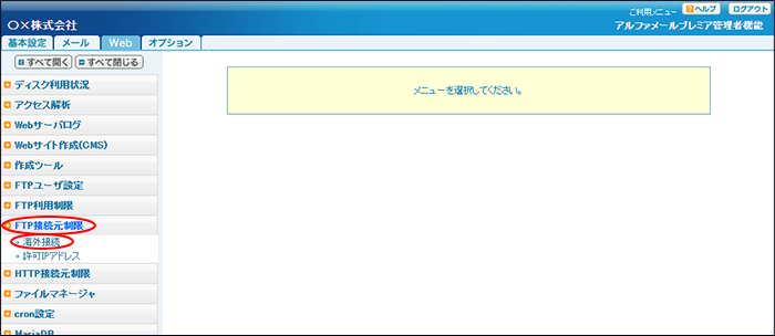 step1 Web画面を表示し、「FTP接続元制限」→「海外接続」の順にクリックします。