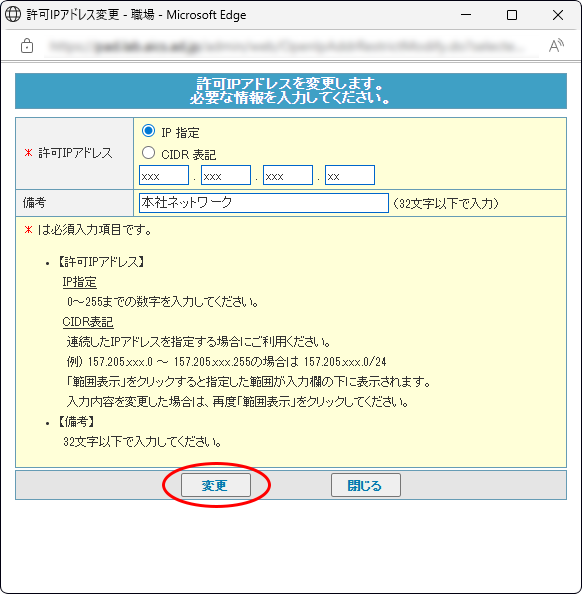 許可IPアドレス変更画面が表示されます。