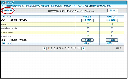 FTP接続元制限 対象ユーザ 一括変更画面が表示されます。