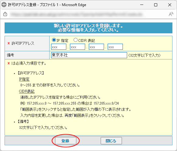 許可IPアドレス登録画面が表示されます。