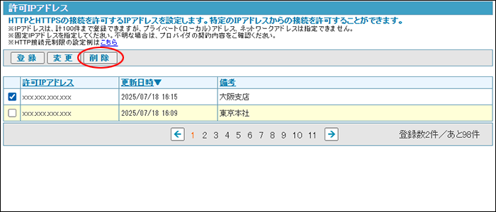 step2 削除する許可IPアドレスを選択し、「削除」ボタンをクリックします。
