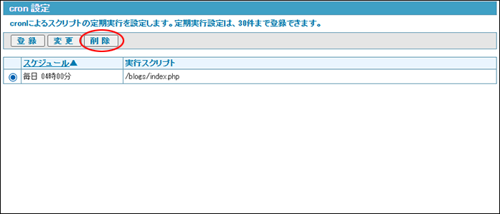 cron設定画面を表示し、削除するスクリプトを選択して「削除」ボタンをクリックします。