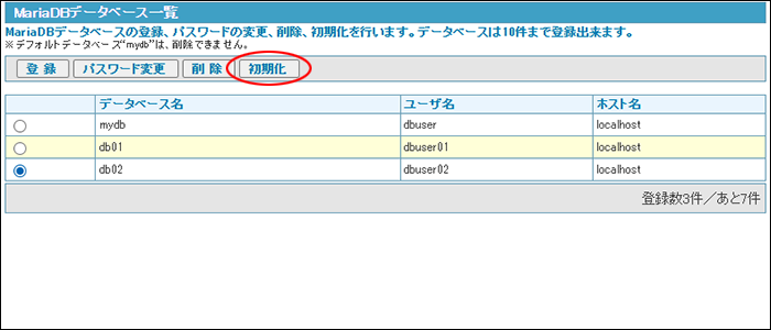 step1 MariaDBデータベース一覧画面を表示し、初期化するデータベースを選択して「初期化」ボタンをクリックします。