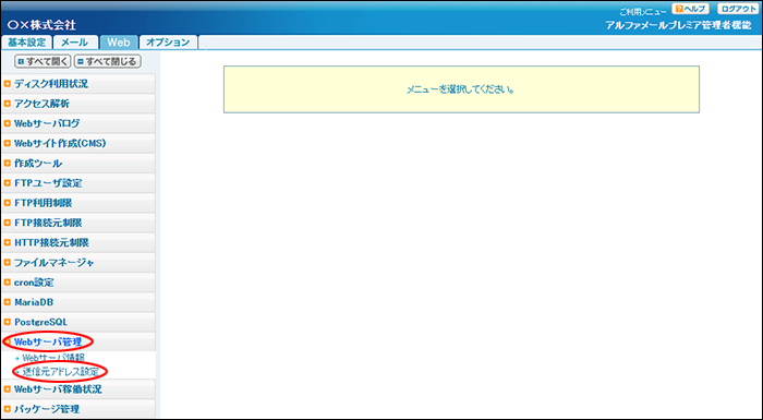 step1 Web画面を表示し、「Webサーバ管理」→「送信元アドレス設定」をクリックします。