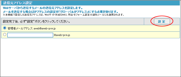 | 管理者メールアドレス | 管理者メールアドレスが、Webサーバから送信するメールの送信元アドレスに設定されます。 |