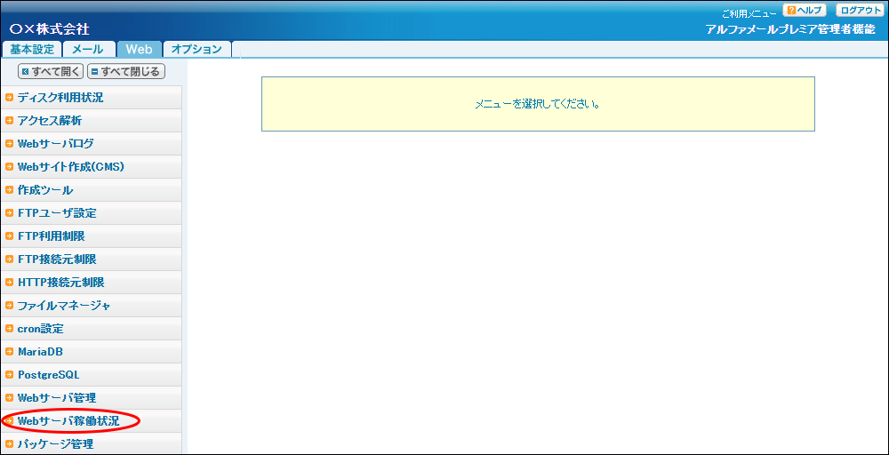 step1 Web画面を表示し、「Webサーバ稼働状況」をクリックします。