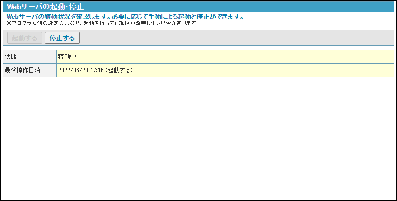 最終操作日時 「起動する」または「停止する」ボタンをクリックした最終日時と操作内容が表示されます。