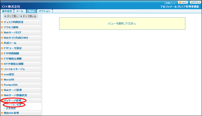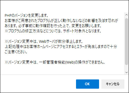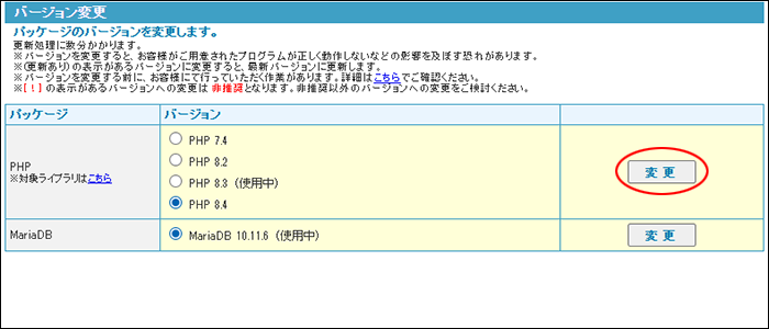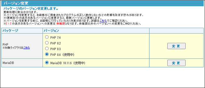 PHPやデータベース(MySQL、MariaDB)のバージョンを変更します。操作はどれも同じ手順で実行できます。以降、例としてPHP のバージョンを変更する手順を説明します。