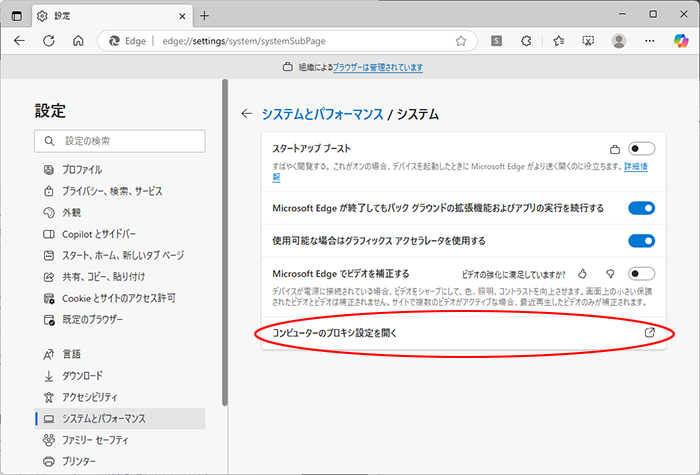 「コンピューターのプロキシ設定を開く」をクリックします。
