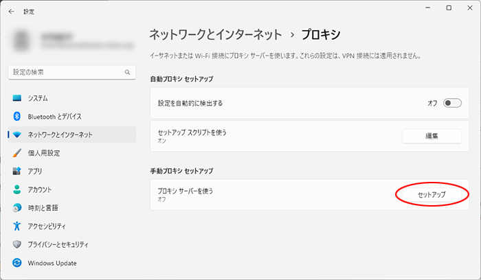 「プロキシサーバーを使う」の「セットアップ」ボタンをクリックします。
