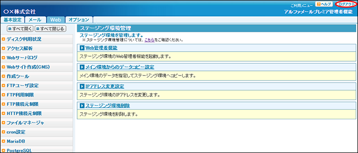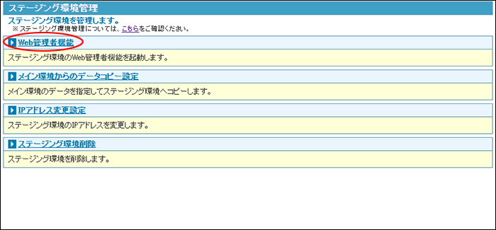 ステージング環境管理画面を表示し、「Web管理者機能」をクリックします。