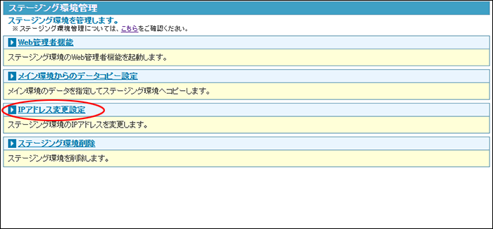 ステージング環境管理画面を表示し、「IPアドレス変更設定」をクリックします。