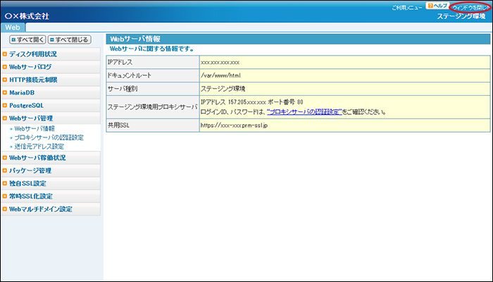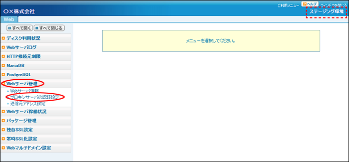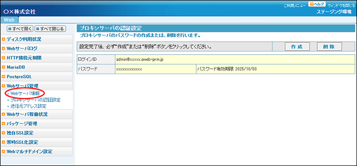 2.ステージング環境のWeb管理者機能が表示されたウィンドウの「Webサーバ管理」→「プロキシサーバの認証設定」をクリックします。