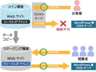 通常ステージング環境は外部へのHTTPS接続ができないため、WordPress等のCMS側の機能を使ったバージョンアップは不可となります。