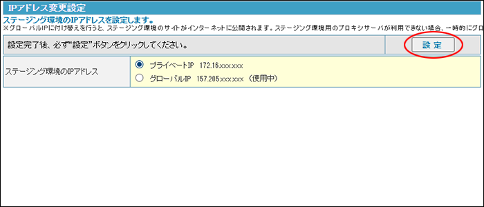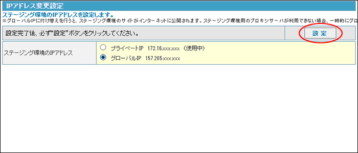 ただし、グローバルIPに切り替えている間は、現在公開されているメイン環境のホームページが外部からアクセス不可になり、ステージング環境のホームページが外部からアクセス可能になります。あらかじめご認識いただいた上で操作を行ってください。
