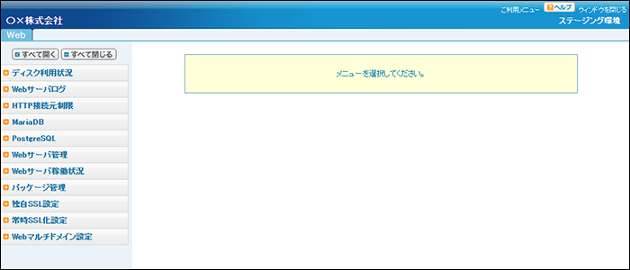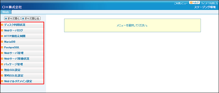 | Webサーバ管理 | Webサーバ情報の確認やWebサーバから送信するメールの送信元アドレスの設定ができます。 ホームページの動作確認時に使用するステージング環境用プロキシサーバの認証情報も確認できます。 操作方法は「Webサーバ管理」、「step1:ステージング環境用プロキシサーバの認証情報の確認」をご覧ください。 |
