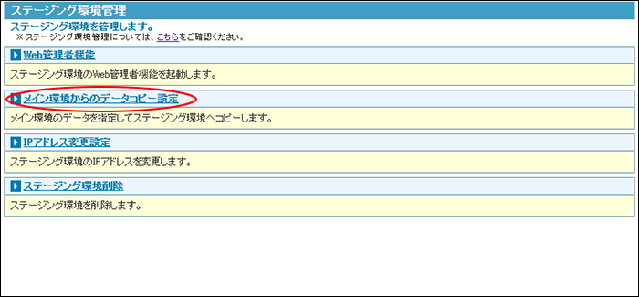 step1 ステージング環境管理画面を表示し、「メイン環境からのデータコピー設定」をクリックします。