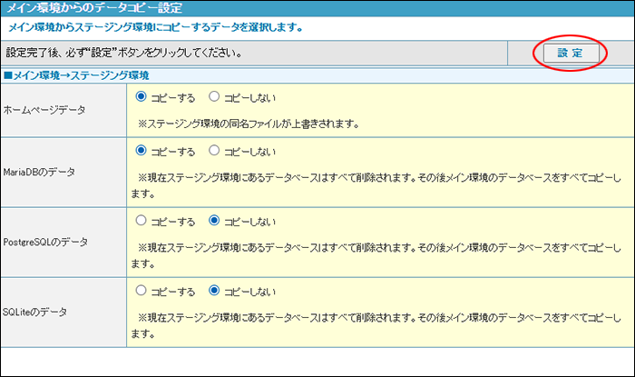 注意ステージング環境にデータが存在する状態で「コピーする」を選択した場合