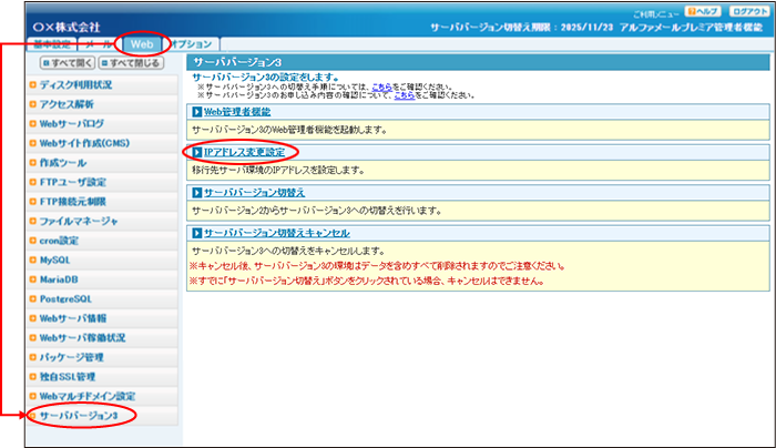 Web画面を表示し、「サーババージョン3」→「IPアドレス変更設定」をクリックします。