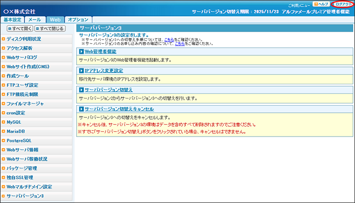 - ホームページやデータベースのデータを移行する選択をされた場合でも、必ず移行されたデータをご確認ください。移行されていないデータがあった場合は、お客様にてサーババージョン2からデータの移行をお願いします。
