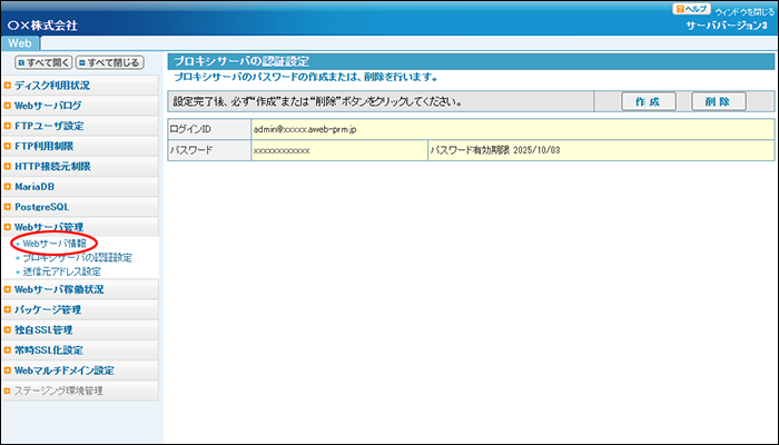 2.サーババージョン3のWeb管理者機能が表示されたウィンドウの「Webサーバ管理」→「プロキシサーバの認証設定」をクリックします。