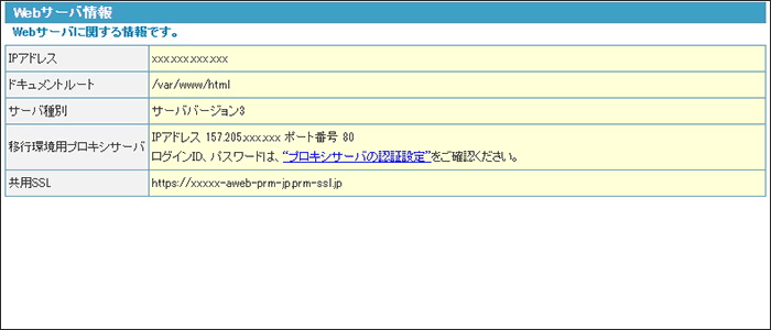 ホームページの動作確認時に使用する移行環境用プロキシサーバの認証情報を確認します。