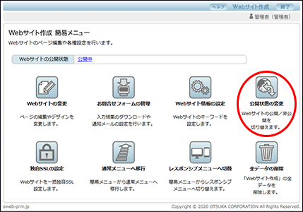 step1 Webサイト作成 簡易メニュー画面を表示し、「公開状態の変更」ボタンをクリックします。