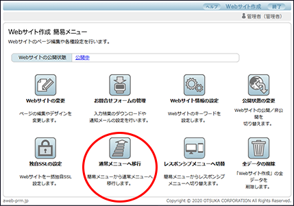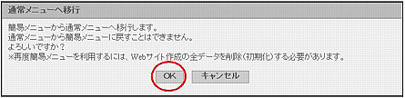 step1 Webサイト作成 簡易メニュー画面を表示し、「通常メニューへ移行」ボタンをクリックします。