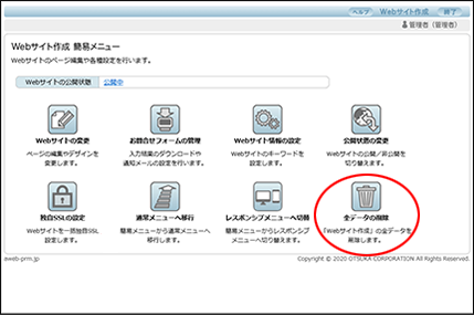 step1 Webサイト作成 簡易メニュー画面を表示し、「全データの削除」ボタンをクリックします。