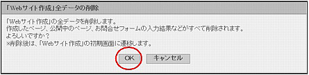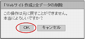 「Webサイト作成」全データの削除画面が表示されます。