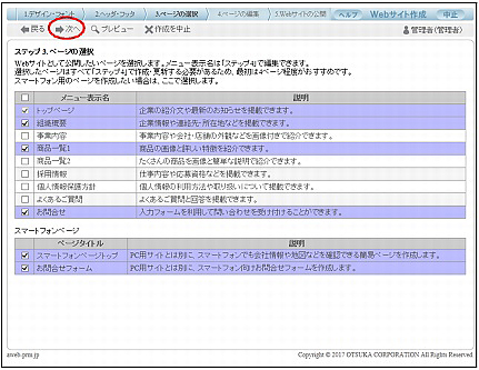 ※ここでは、トップページの他に、「組織概要」「商品一覧1」「お問合せ」「スマートフォンページトップ」「お問合せフォーム」のページを選択しています。最初は、4~5ページ程度をお勧めします。