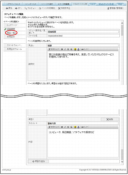 ページ編集:組織概要画面が表示されます。
