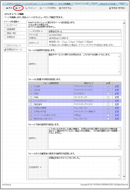 step14 必要事項を入力します。すべてのページ編集が完了したら、「次へ」をクリックします。