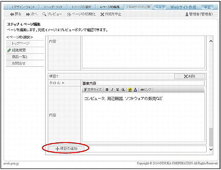 「会社概要」、「商品情報、サービス内容など、画像付きの項目」は、必要に応じて、0個~5個まで設定することが可能です。詳しくは、「項目を追加する」をご覧ください。